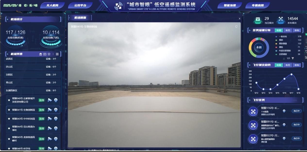 2023年起,东湖高新区自然资源和规划局联合武汉市测绘研究院,将11个无人机场站网格化部署于花山、豹澥、九峰等9个街道,全面接入“城市智眼”政务监管系统,开启自然资源领域低空监管新实践。