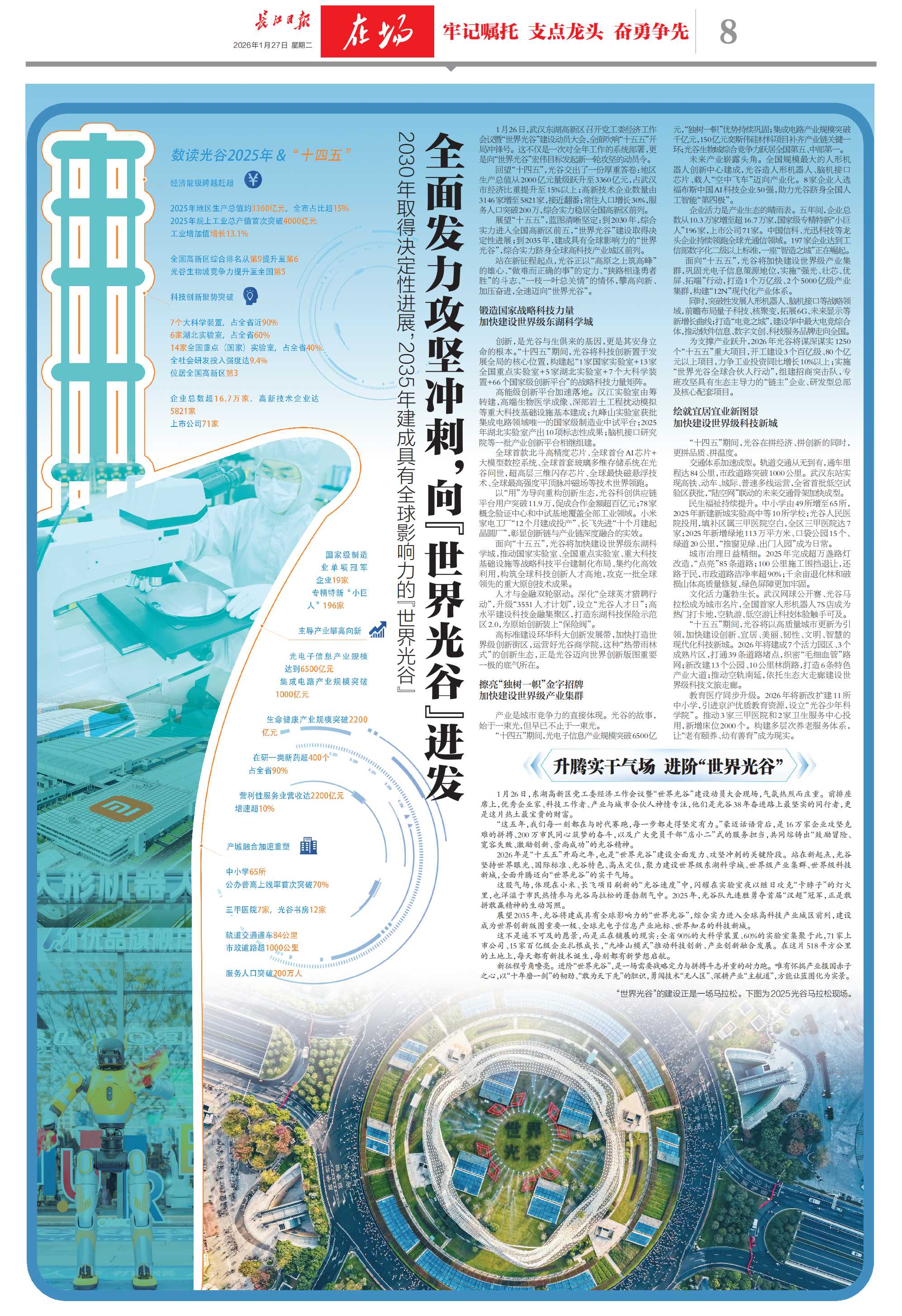 1月27日,《湖北日报》《长江日报》刊发整版报道,回顾光谷“十四五”和2025年工作成绩,介绍“世界光谷”建设和2026年发展规划。以下为全文转载。