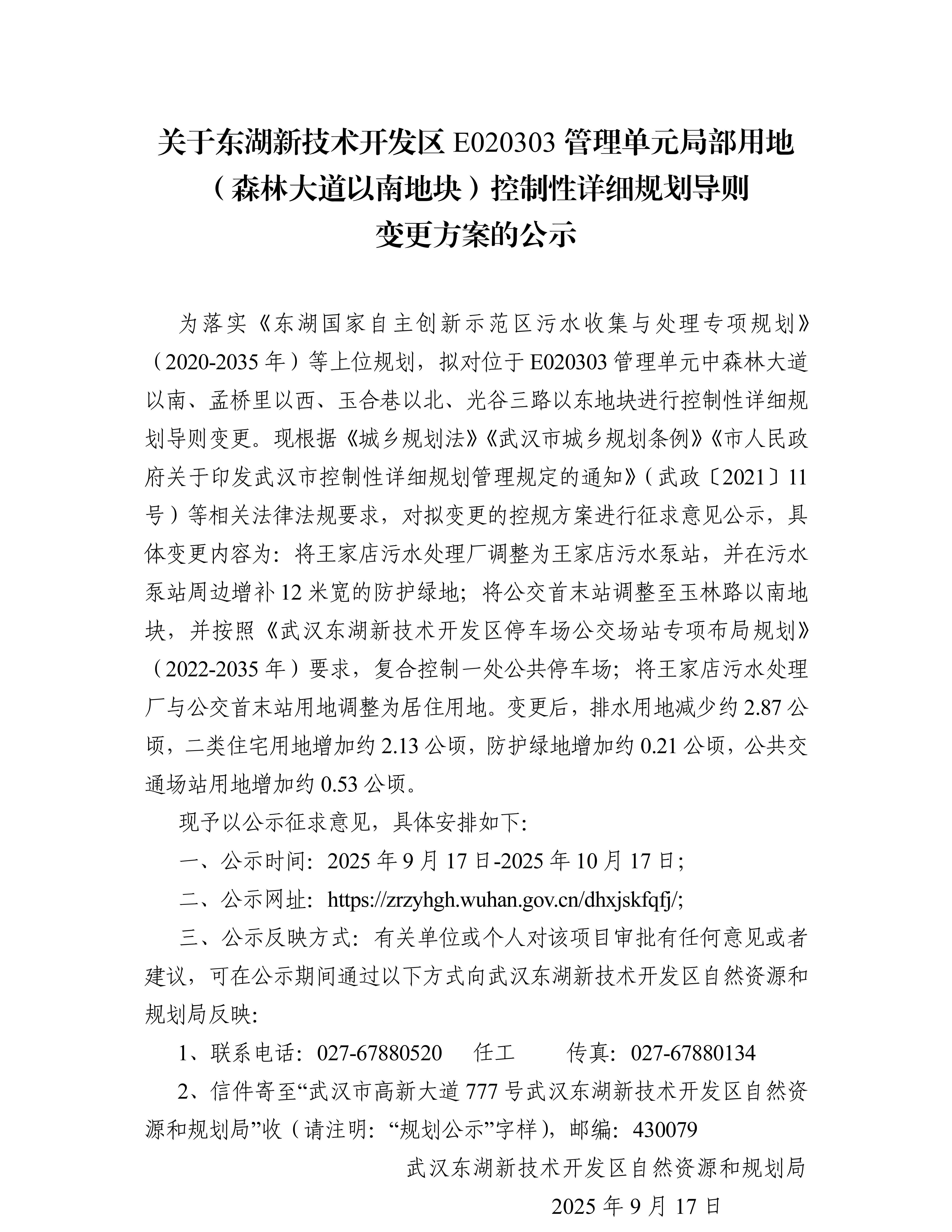 关于东湖新技术开发区E020303管理单元局部用地(森林大道以南地块)控制性详细规划导则变更方案的公示