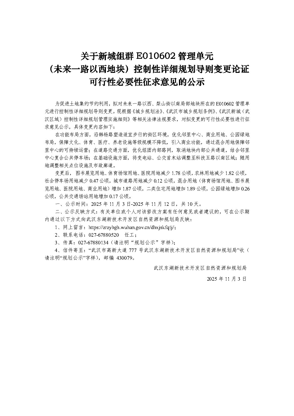 关于新城组群E010602管理单元(未来一路以西地块)控制性详细规划导则变更论证可行性必要性征求意见的公示