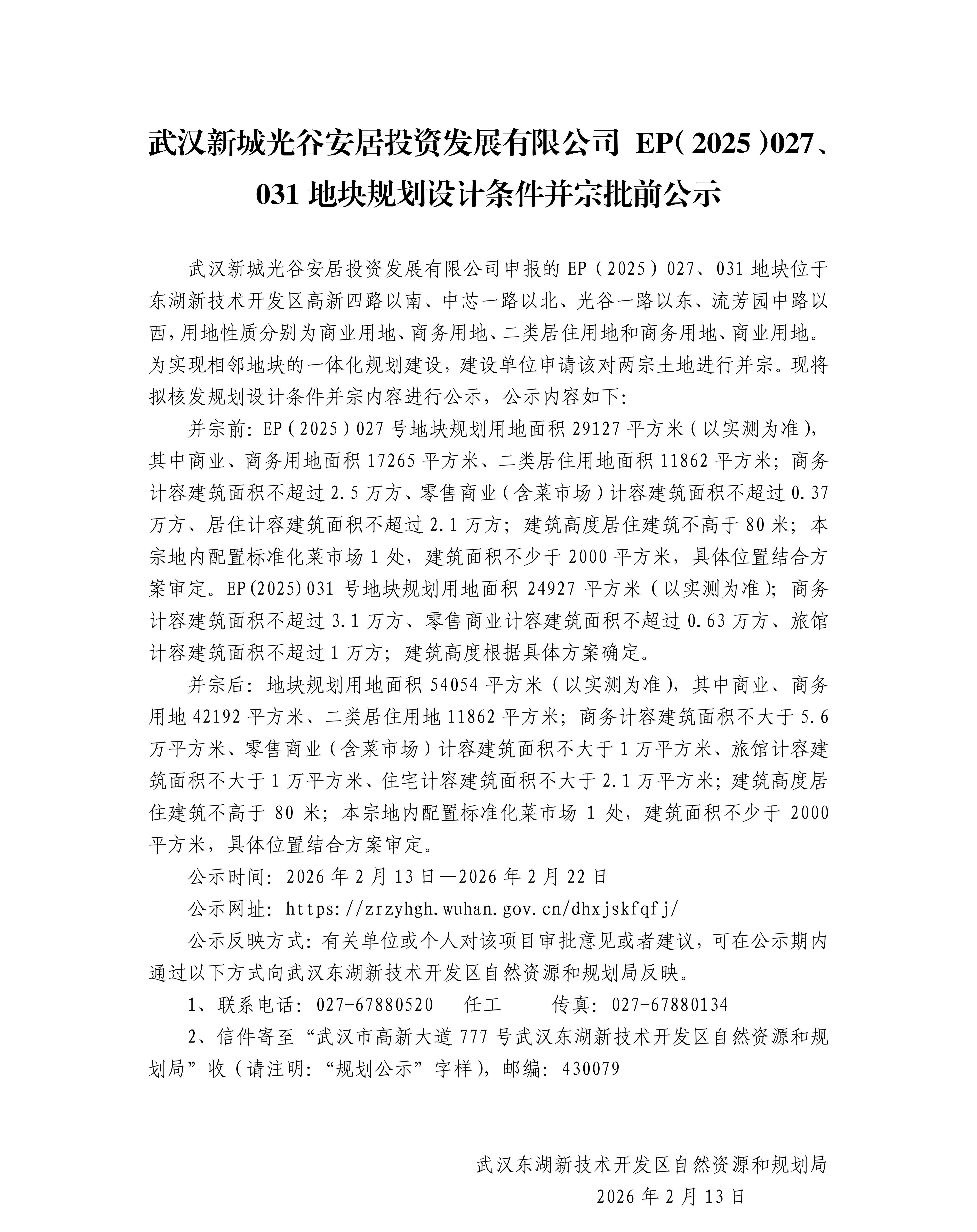 武汉新城光谷安居投资发展有限公司 EP(2025)027、 031地块规划设计条件并宗批前公示