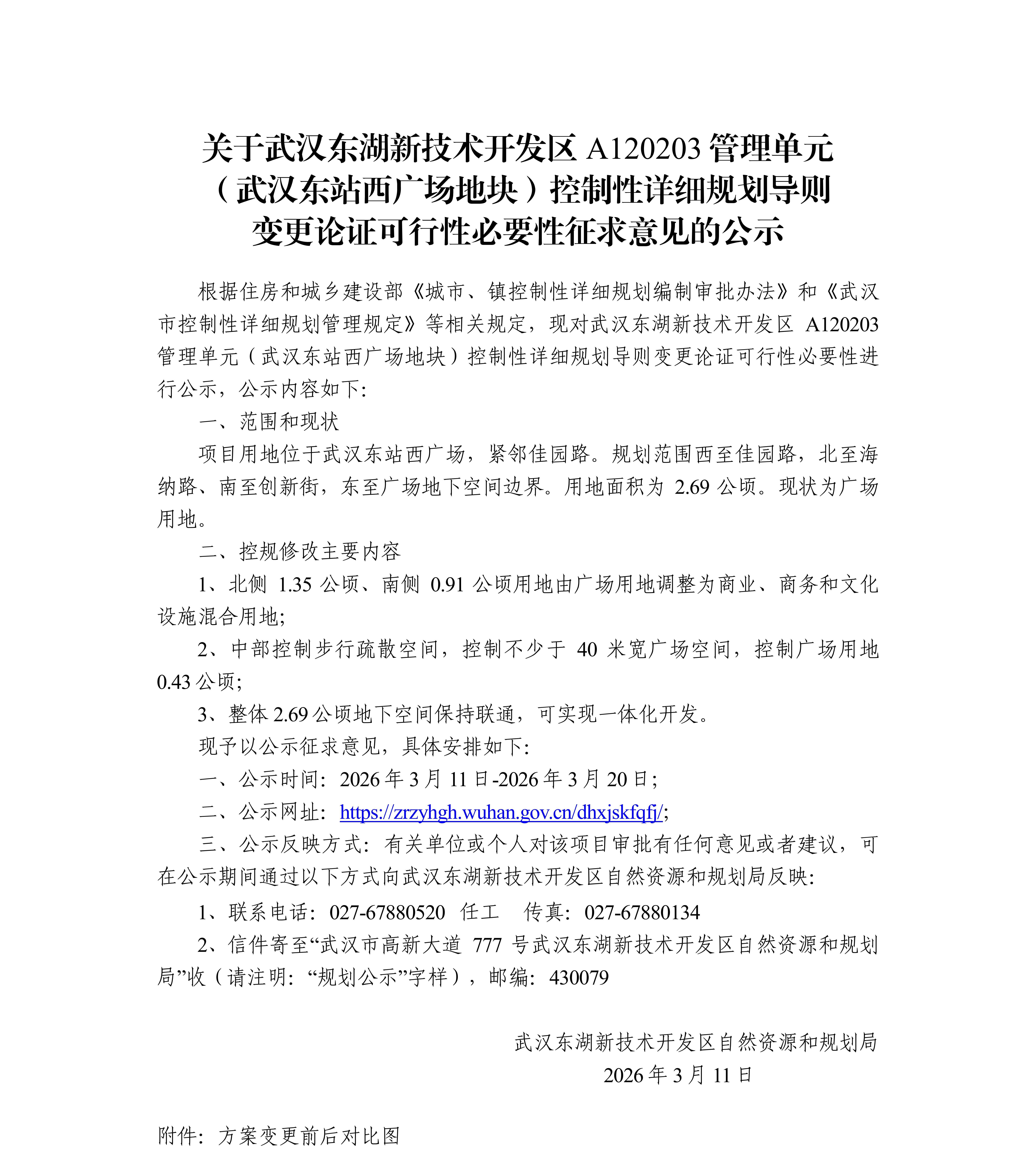 关于武汉东湖新技术开发区A120203管理单元(武汉东站西广场地块)控制性详细规划导则变更论证可行性必要性征求意见的公示