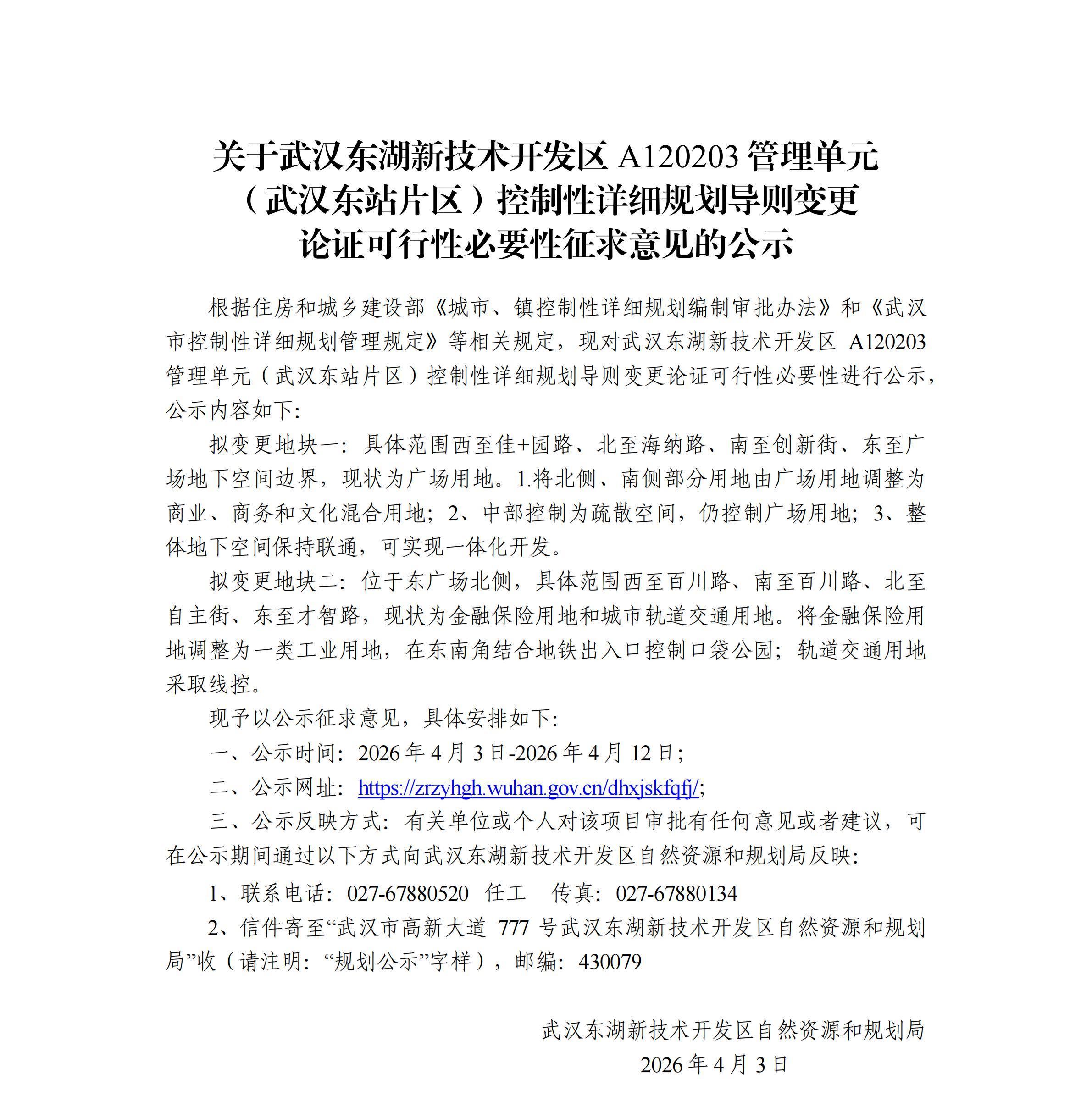 关于武汉东湖新技术开发区 A120203 管理单元(武汉东站片区)控制性详细规划导则变更论证可行性必要性征求意见的公示