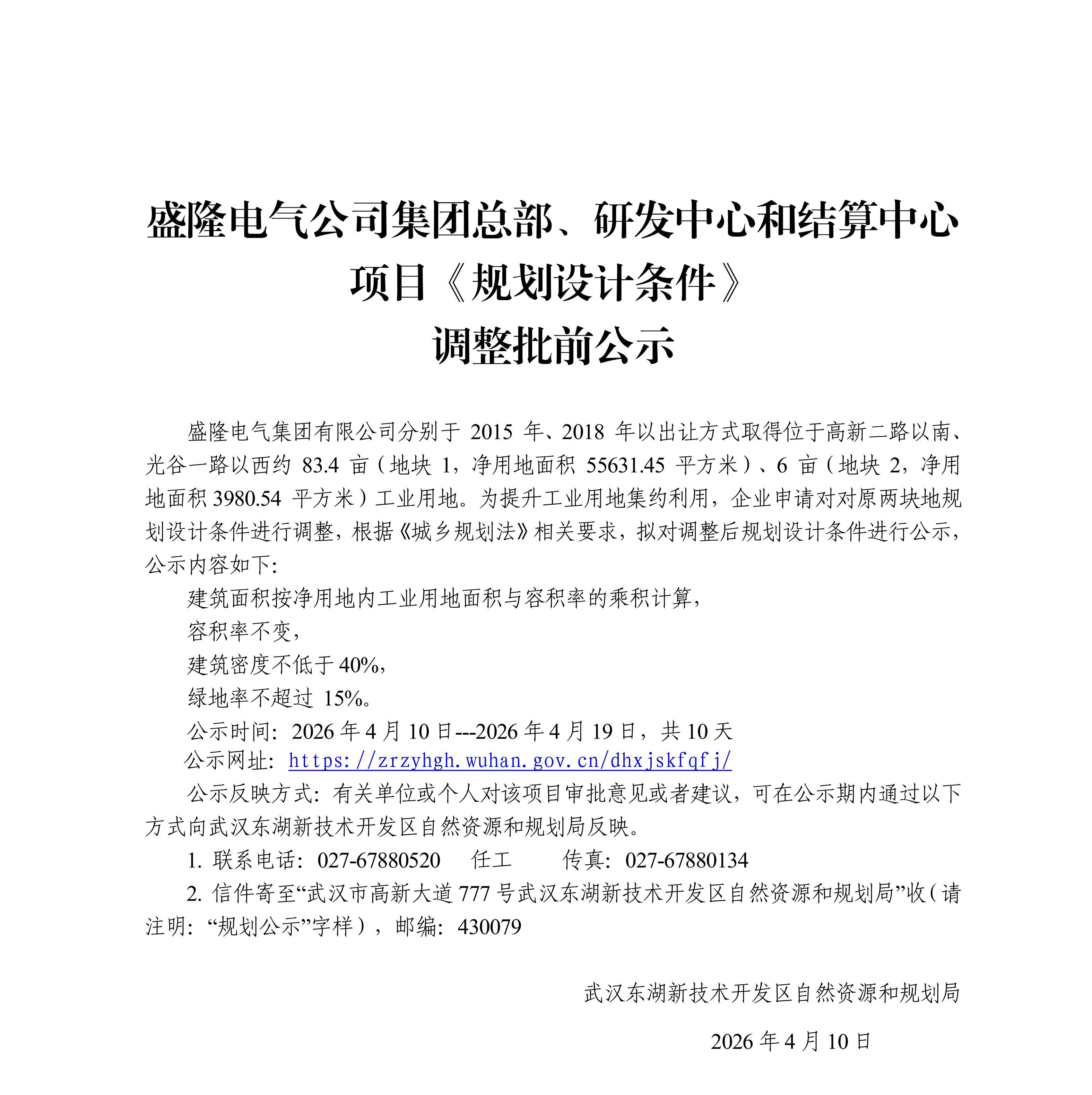 盛隆电气公司集团总部、研发中心和结算中心项目《规划设计条件》调整批前公示