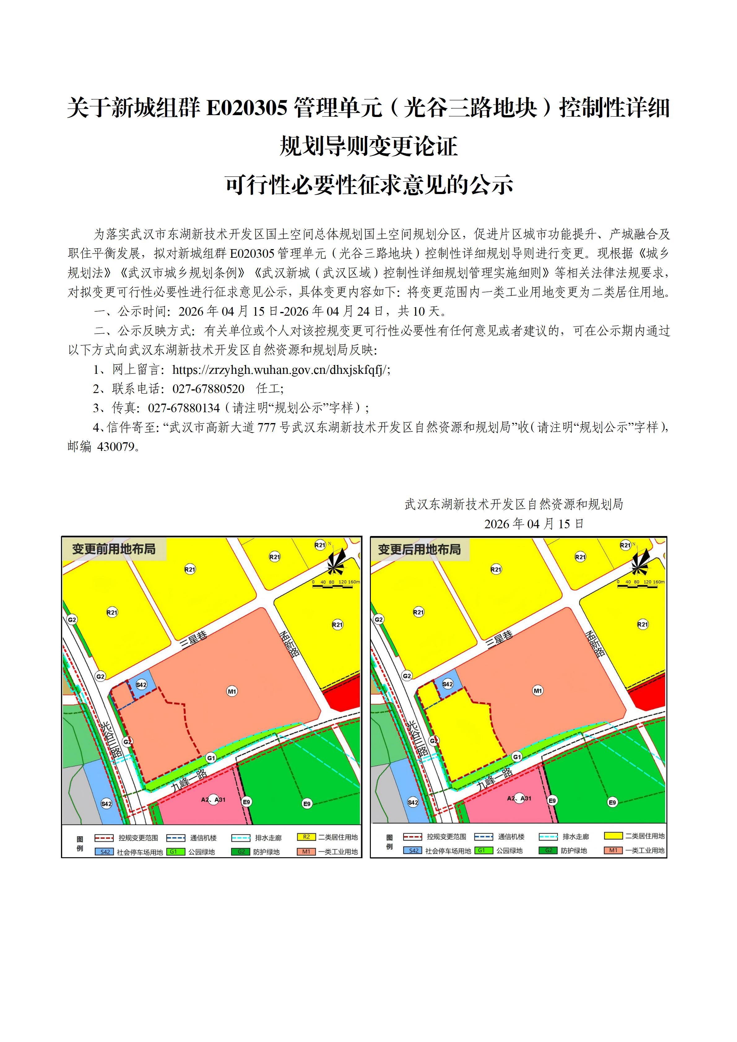 关于新城组群E020305管理单元(光谷三路地块)控制性详细规划导则变更论证可行性必要性征求意见的公示