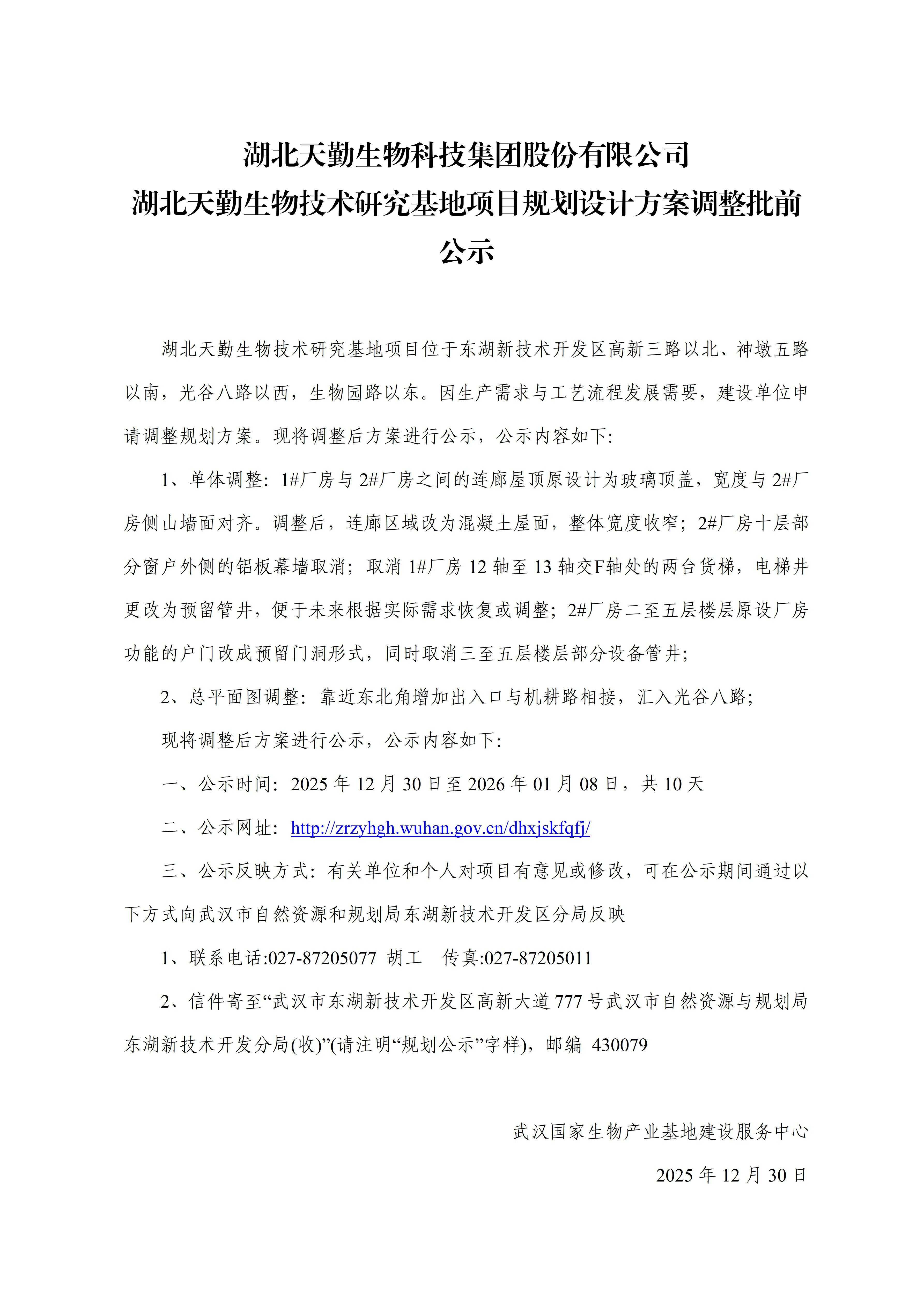 湖北天勤生物科技集团股份有限公司湖北天勤生物技术研究基地项目规划设计方案调整批前公示