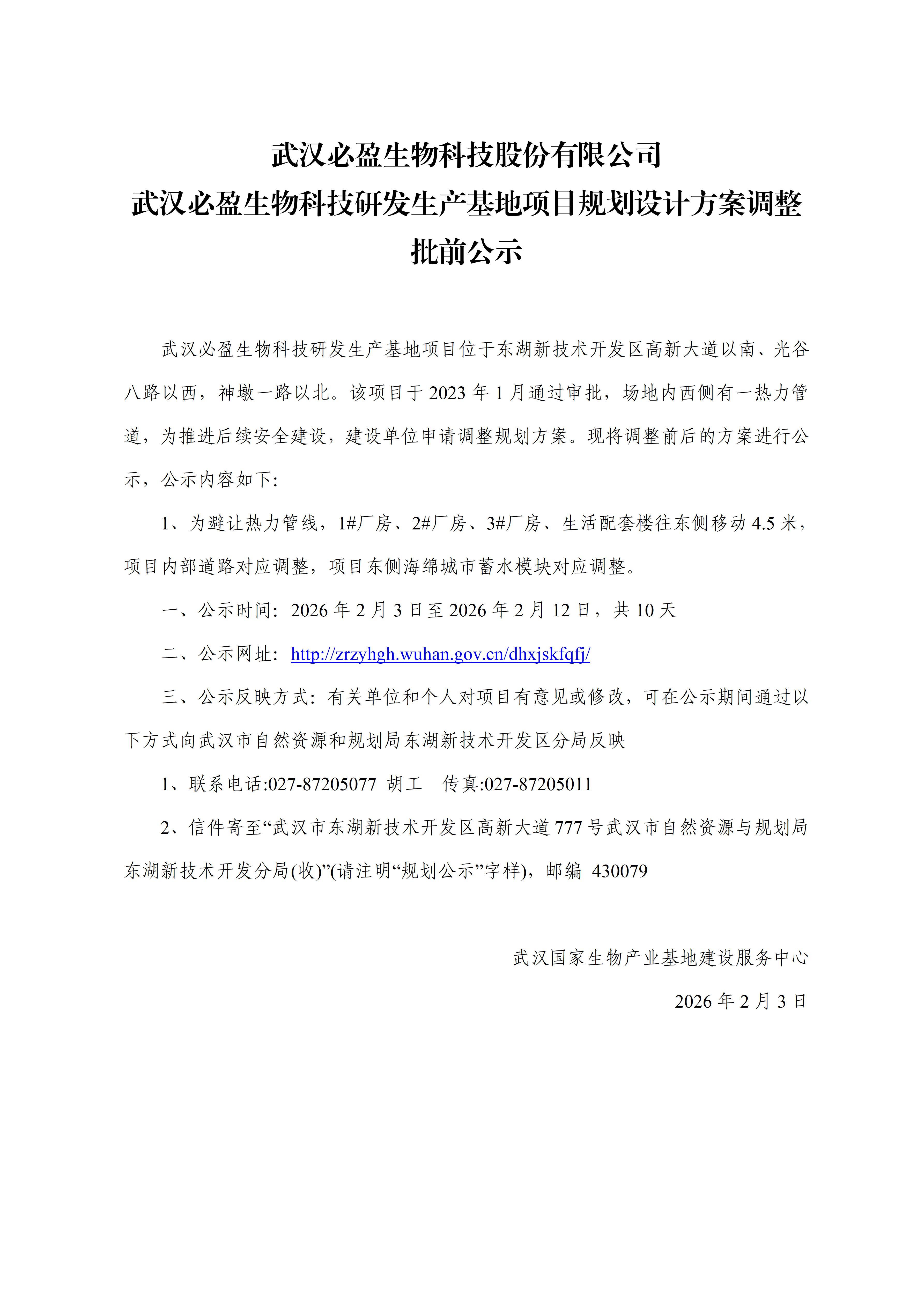 武汉必盈生物科技股份有限公司武汉必盈生物科技研发生产基地项目规划设计方案调整批前公示