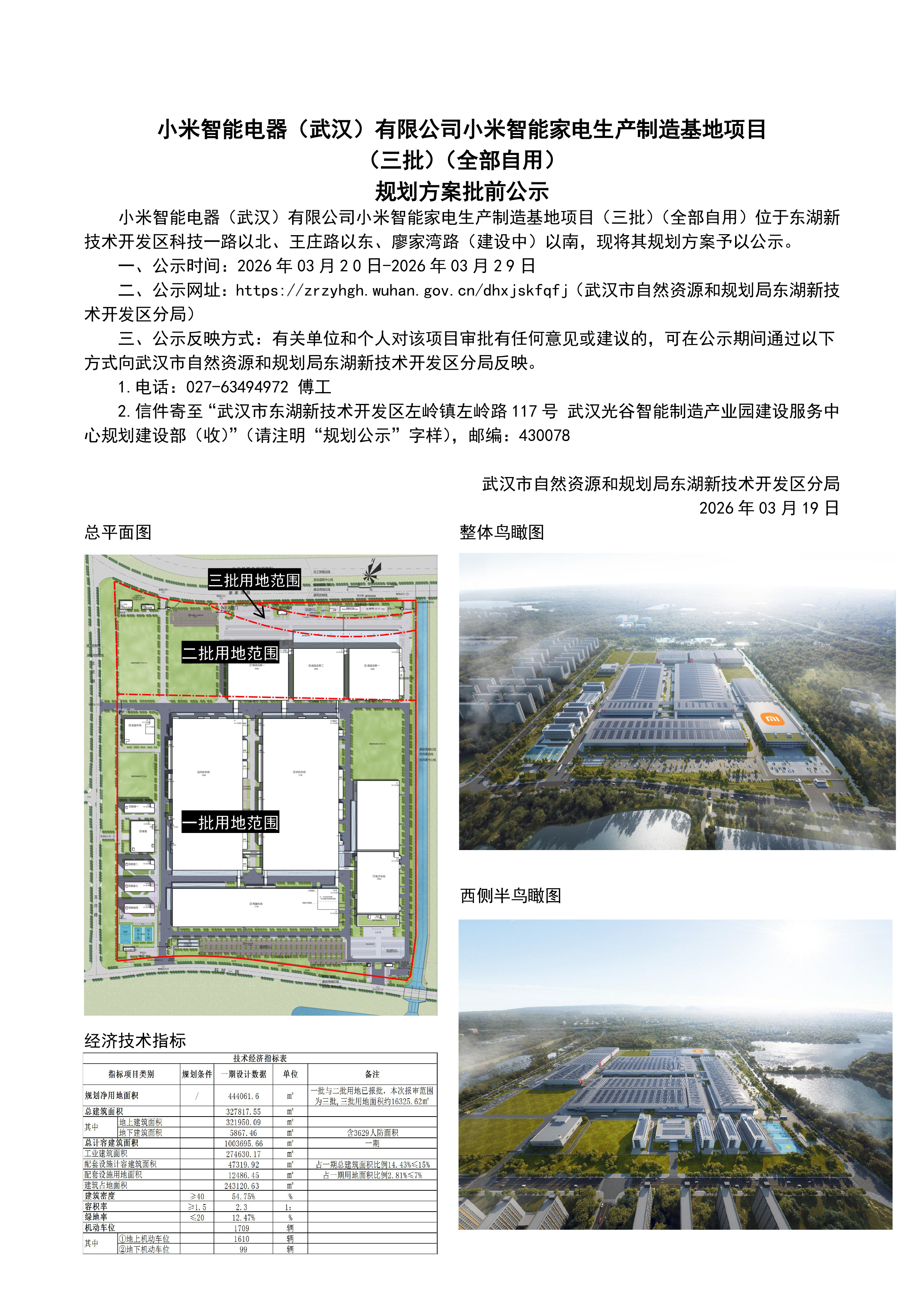 小米智能电器(武汉)有限公司小米智能家电生产制造基地项目(三批)(全部自用)规划设计方案批前公示