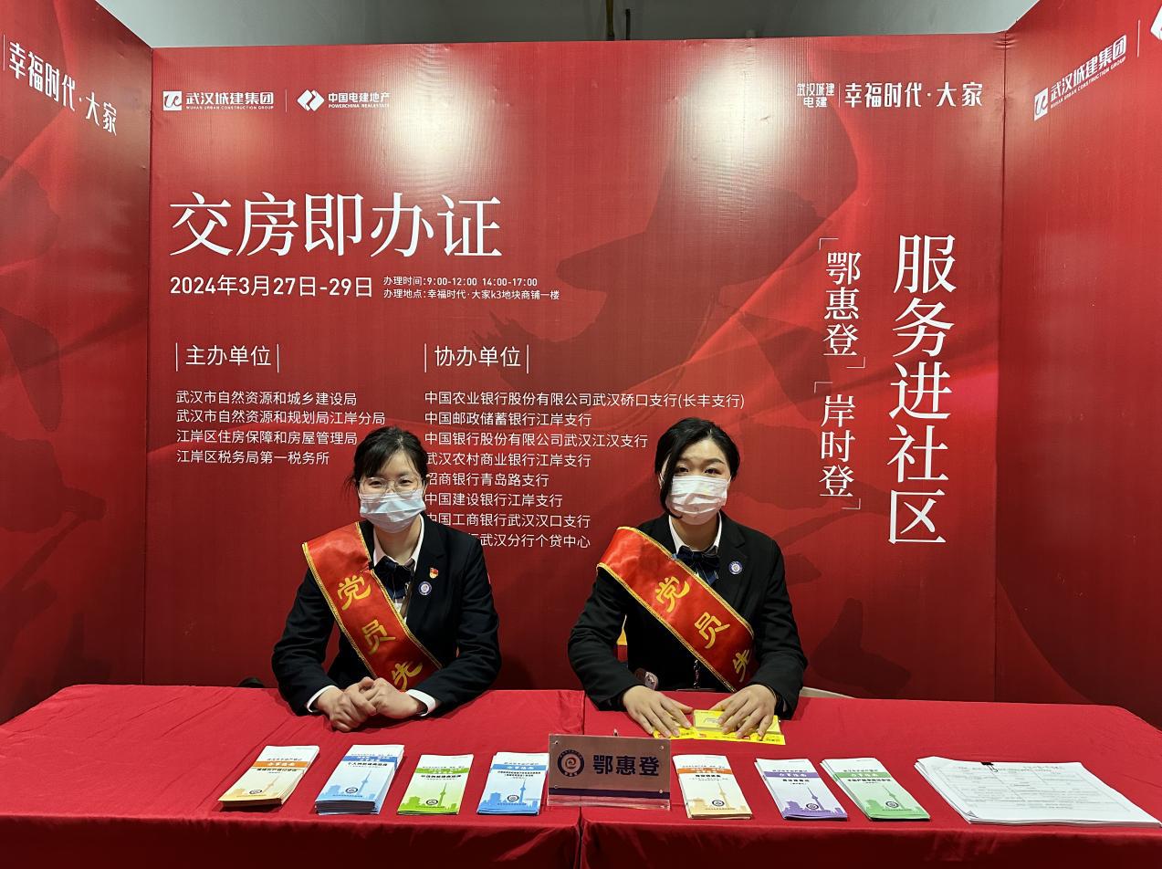 为深入推进“不动产登记+企业服务”模式,武汉市自然资源和规划局江岸分局2024年3月27日至29日,联合江岸区住房保障和房屋管理局、江岸区税务局第一税务所、金融机构、武汉城建集团、中国电建地产,组织党员先锋队、“岸时登”成员、青年文明号成员走进辖区“幸福时代·大家”社区,开展为期三天的“交房即办证”进社区服务活动,现场为小区业主核发电子证照及《不动产权证书》,并提供不动产登记咨询服务,实现“收楼”与“领证”同时办理。