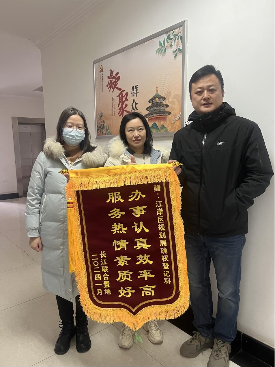 1月22日,湖北长江联合置地有限公司送来锦旗,为分局在办理不动产首次登记手续时高效的工作作风、全心全意为企业服务的精神点赞。
