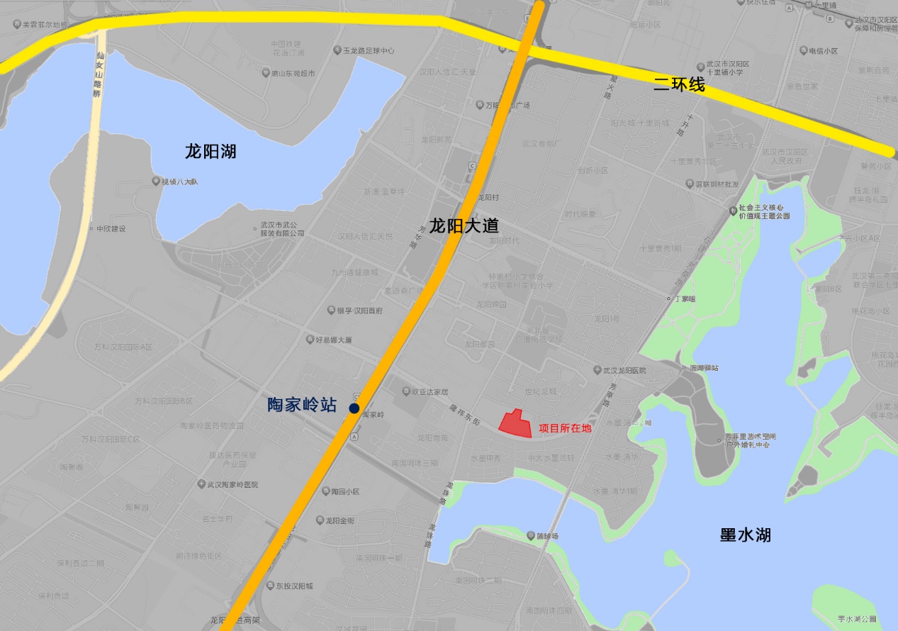 项目基地交通便利,距地铁三号线陶家岭站直线距离约200m,南隔隆祥东街可眺望墨水湖,西临龙珠路,东接芳草路,交通环境条件较为优沃。