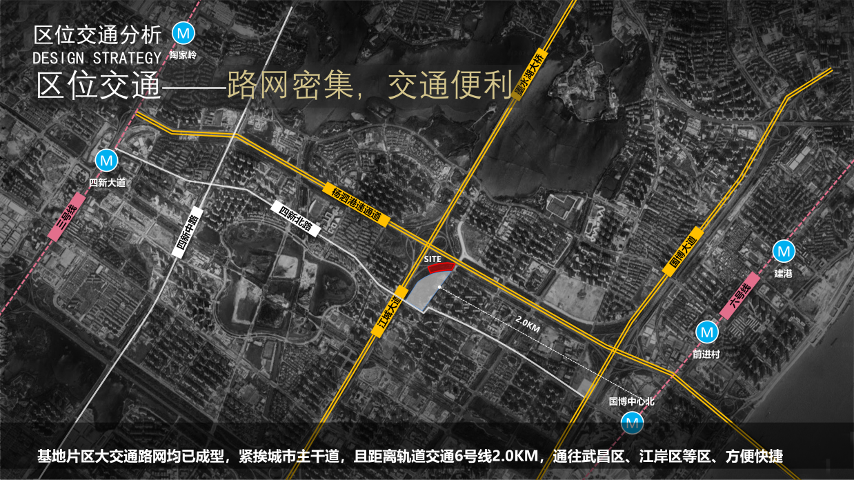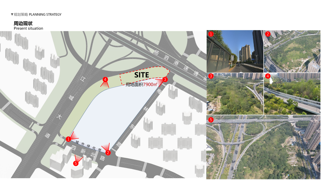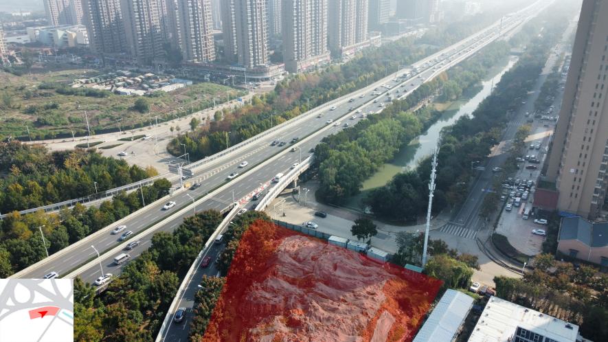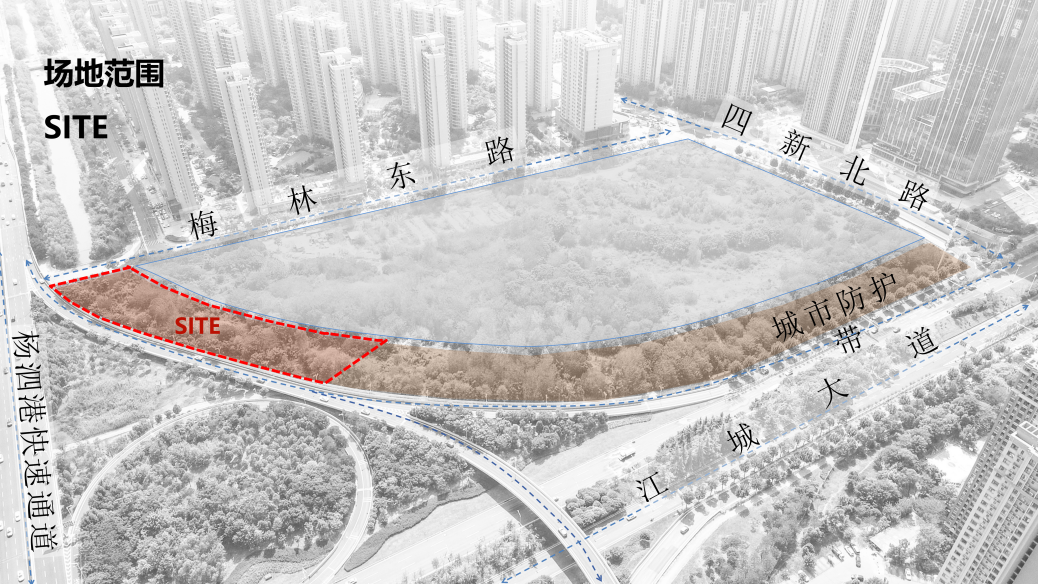 场地周边环境及衔接要求:场地位于杨泗港快速路与江城大道交汇立交东南角,汉阳鲤鱼洲C3地块内。设计范围北侧紧邻杨泗港快速路匝道及隔离绿化带,东部紧邻梅林东路及梅林一街。设计范围南部为规划建设幼儿园及若干住宅建筑。为考虑设计方案结合建设规划及未来可实施性,方案需与地块总体规划及已实施的转角示范区(2000㎡)及整体规划协调。