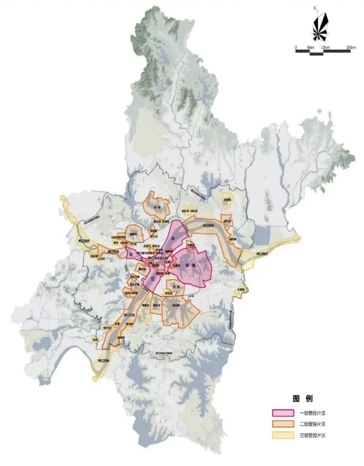 三级片区为两江四岸(都市发展区外)及塔子湖等24个城市公共型湖泊周边区域为管控范围。