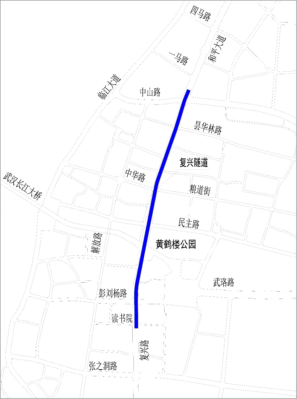 位于武昌区,南起读书院,北至一马路,全长2080米。“复兴隧道”为复兴路派生名,同时意指武昌古城借城市隧道传承“复兴要义”,建设千年古轴,复兴中华文化,故命名“复兴隧道”。