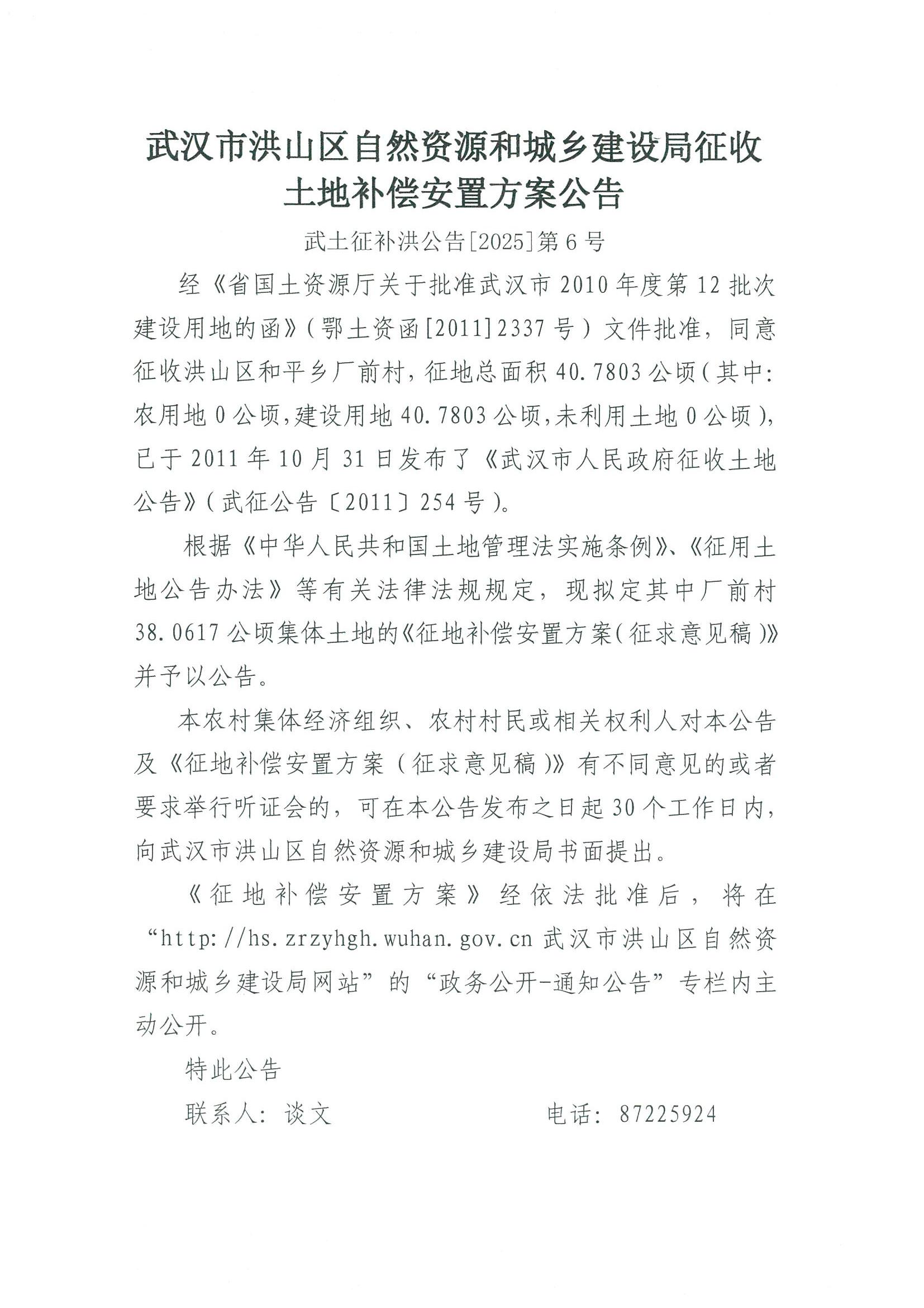 征收土地补偿安置方案公告(武土征补洪公告[2025]第6号)