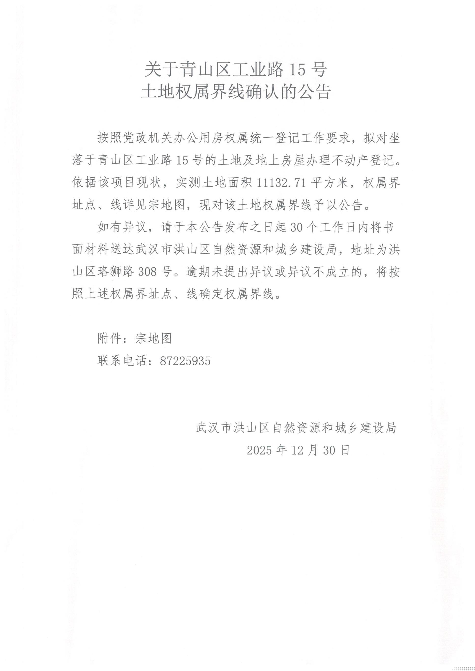 关于青山区工业路15号土地权属界线确认的公告