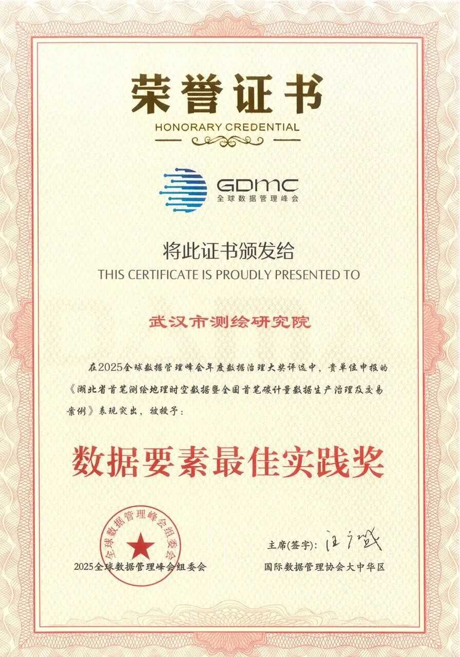 近日,2025全球数据管理峰会在杭州举行,此次峰会由国际数据管理协会、商务部与浙江省人民政府携手联合主办。武汉市测绘研究院《湖北省首笔测绘地理时空数据暨全国首笔碳计量数据生产治理及交易案例》获“2025全球数据要素最佳实践奖”。