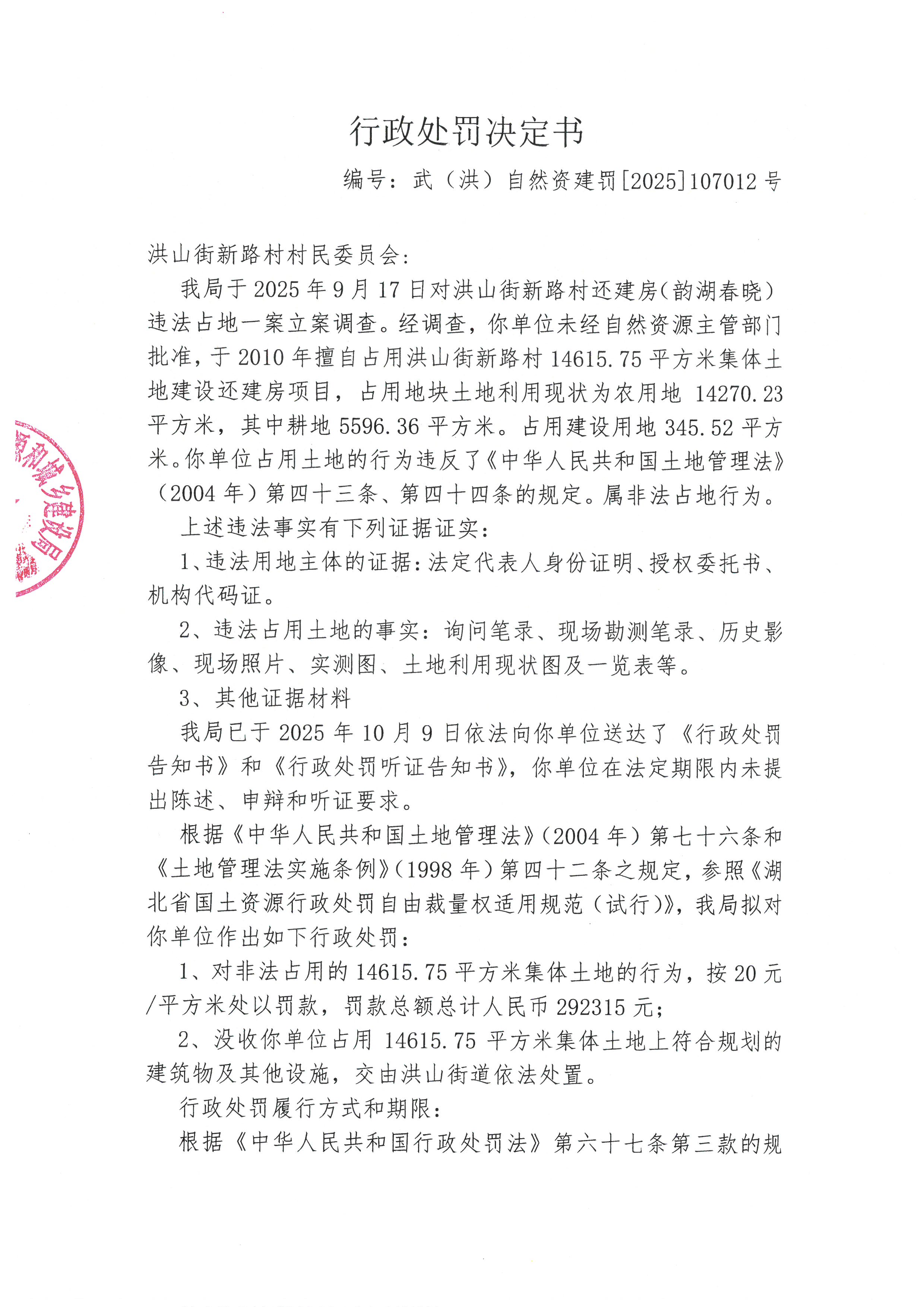 洪山街新路村村民委员会建设还建房(韵湖春晓)行政处罚决定书