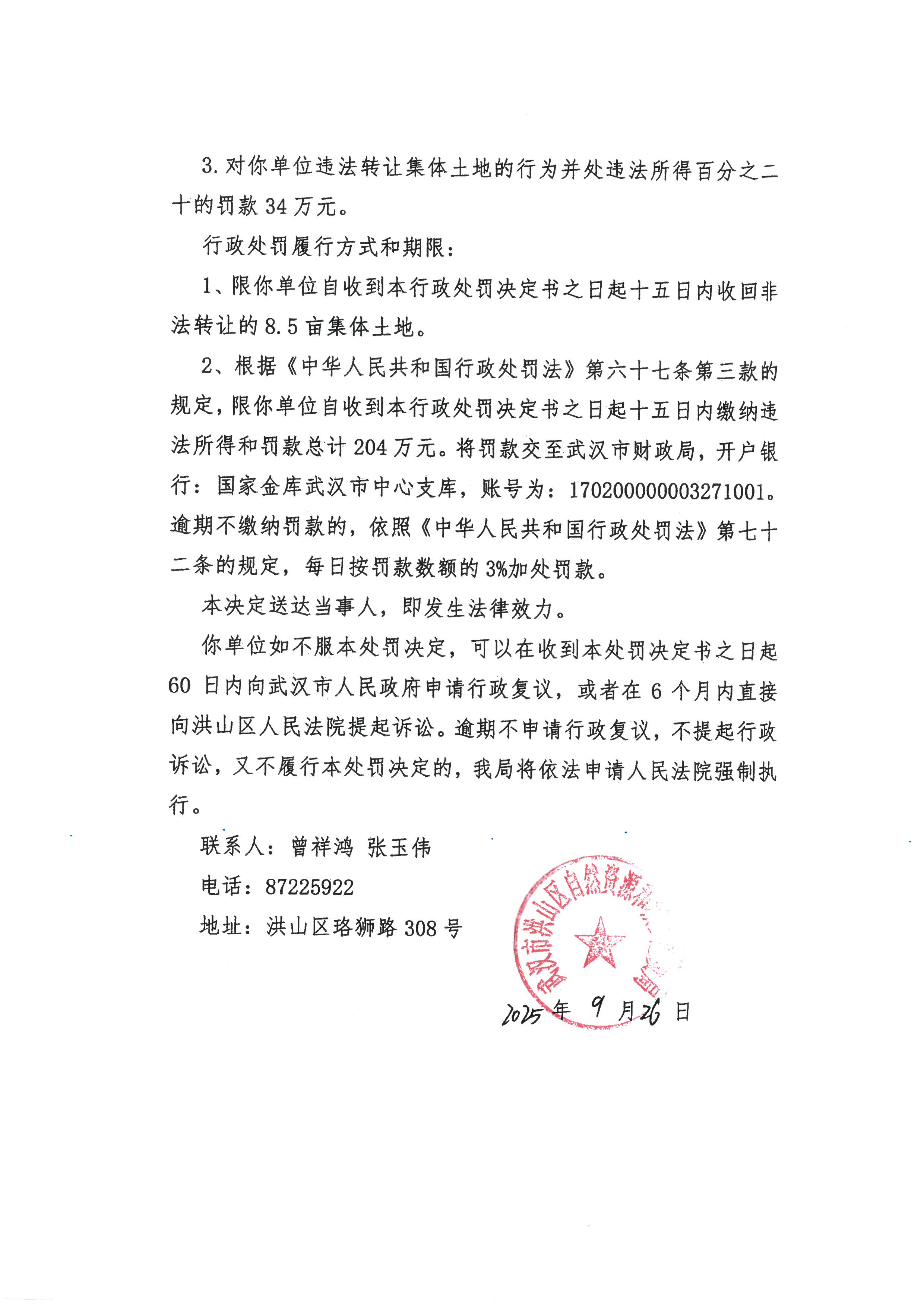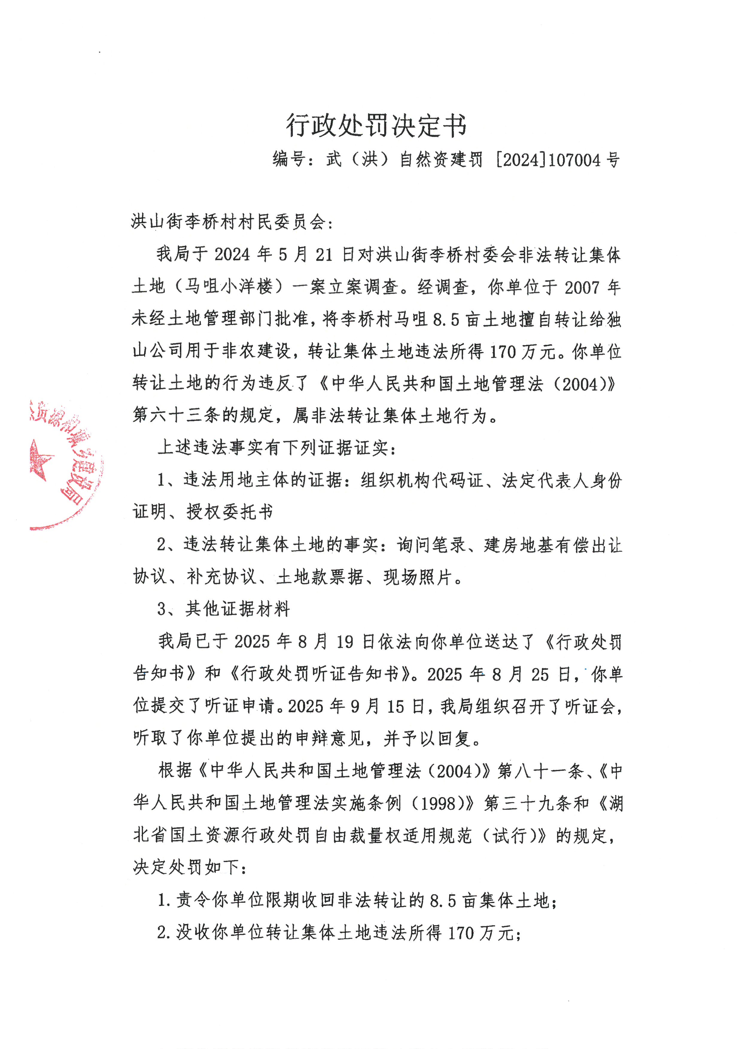 洪山街李桥村村民委员会(独山公司)行政处罚决定书