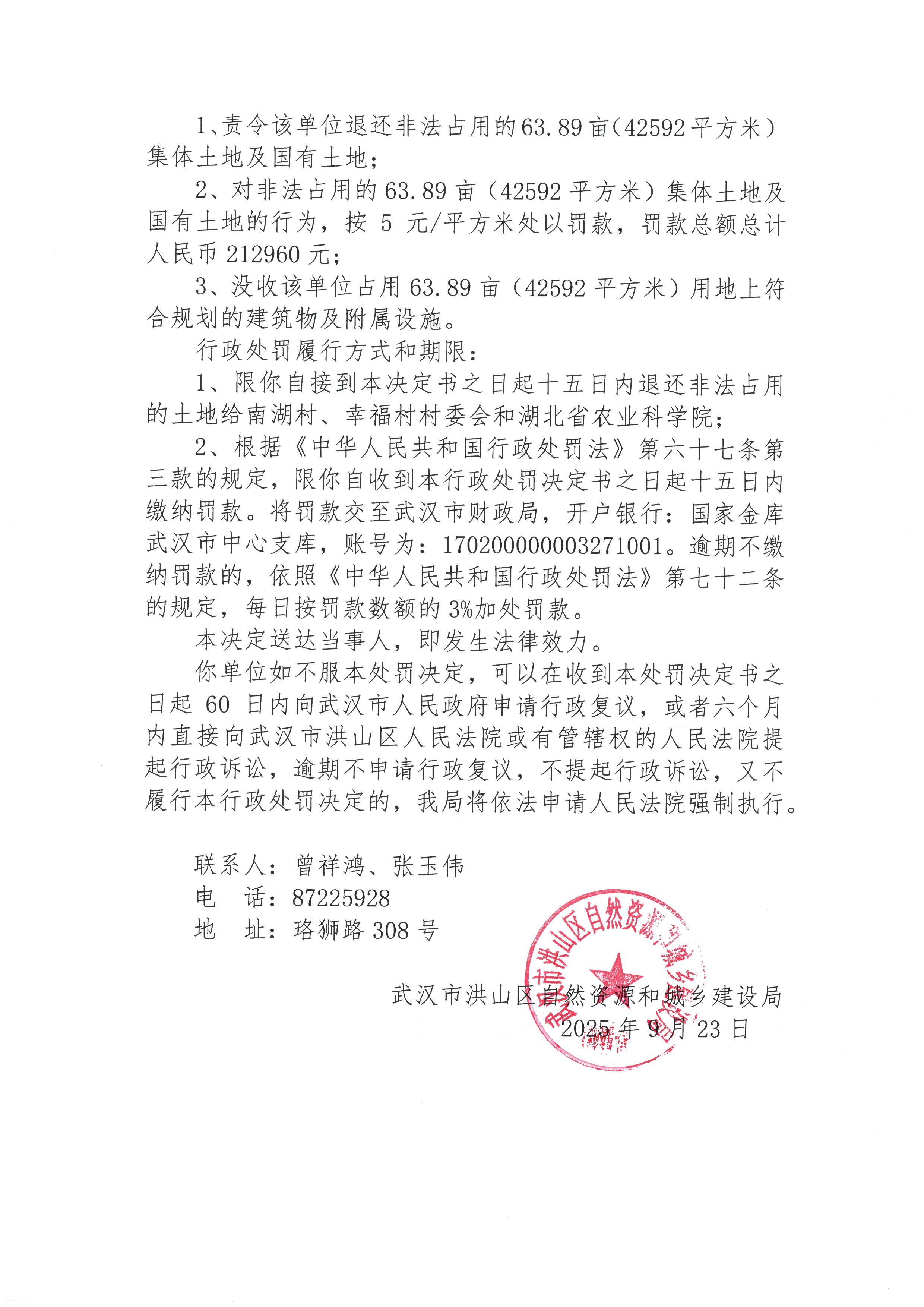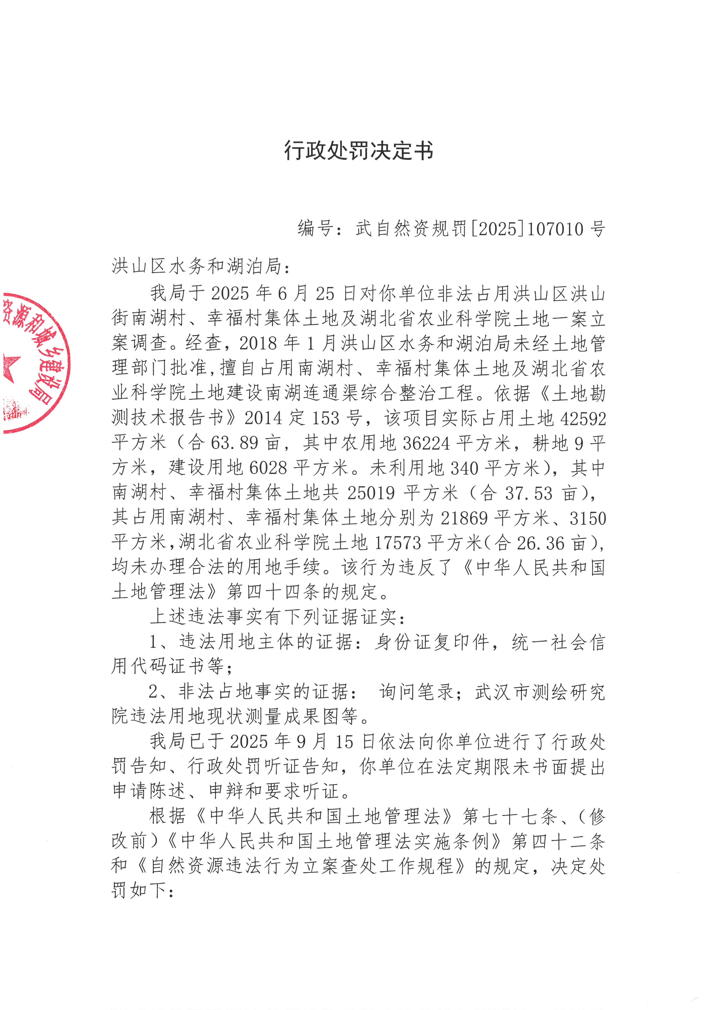 洪山区水务和湖泊局建设南湖连通渠综合整治工程行政处罚决定书