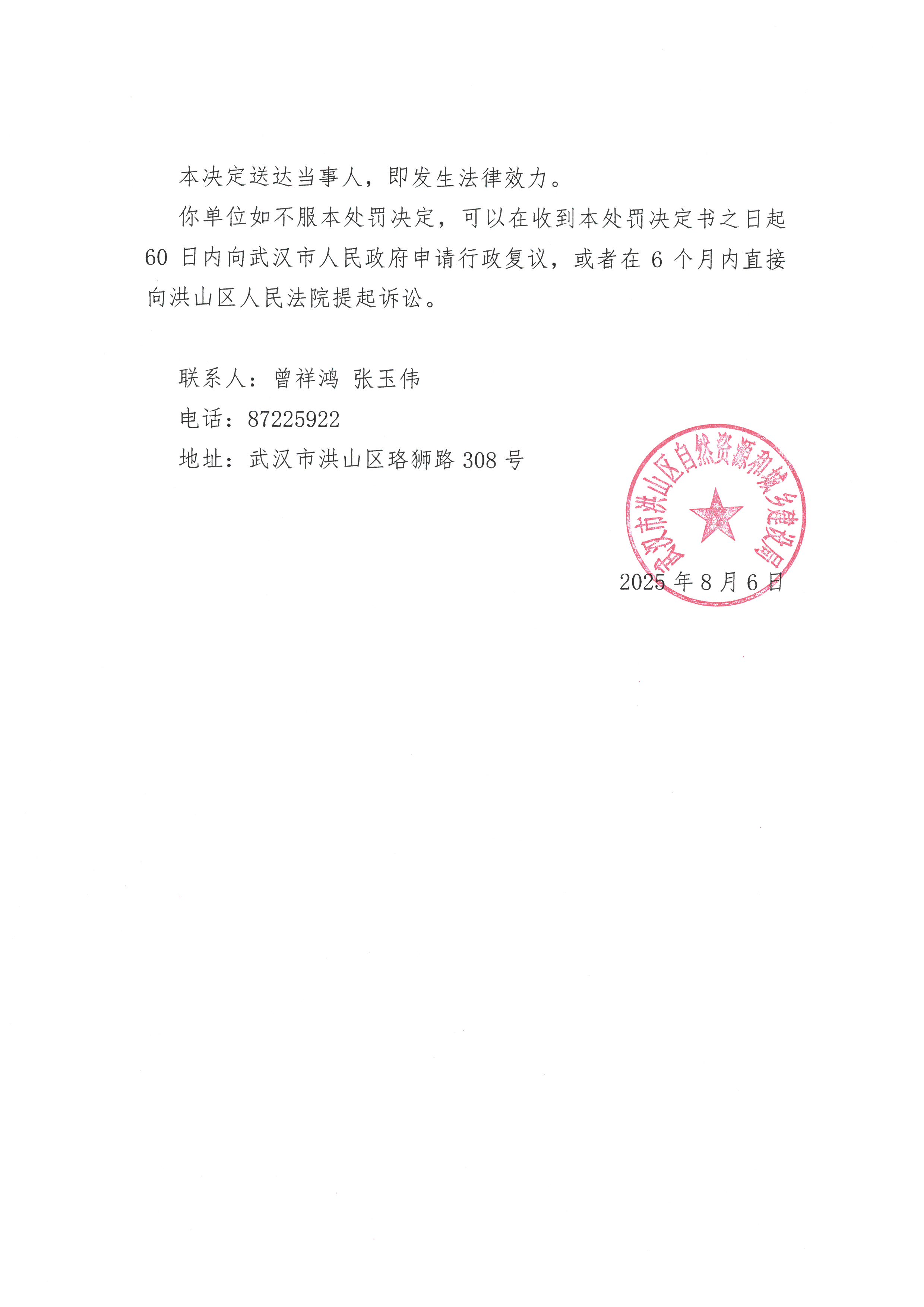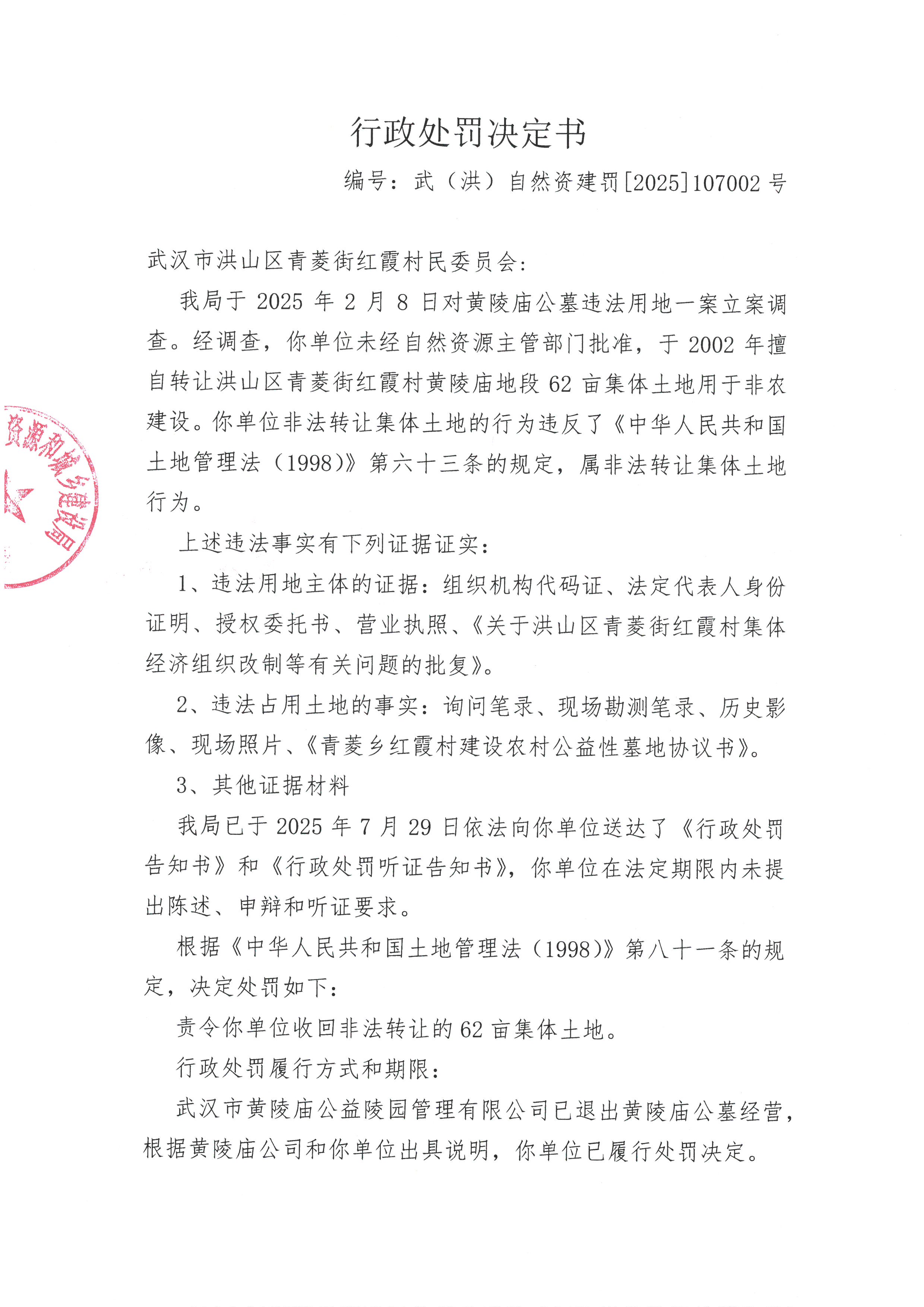 武汉市洪山区青菱街红霞村民委员会行政处罚决定书