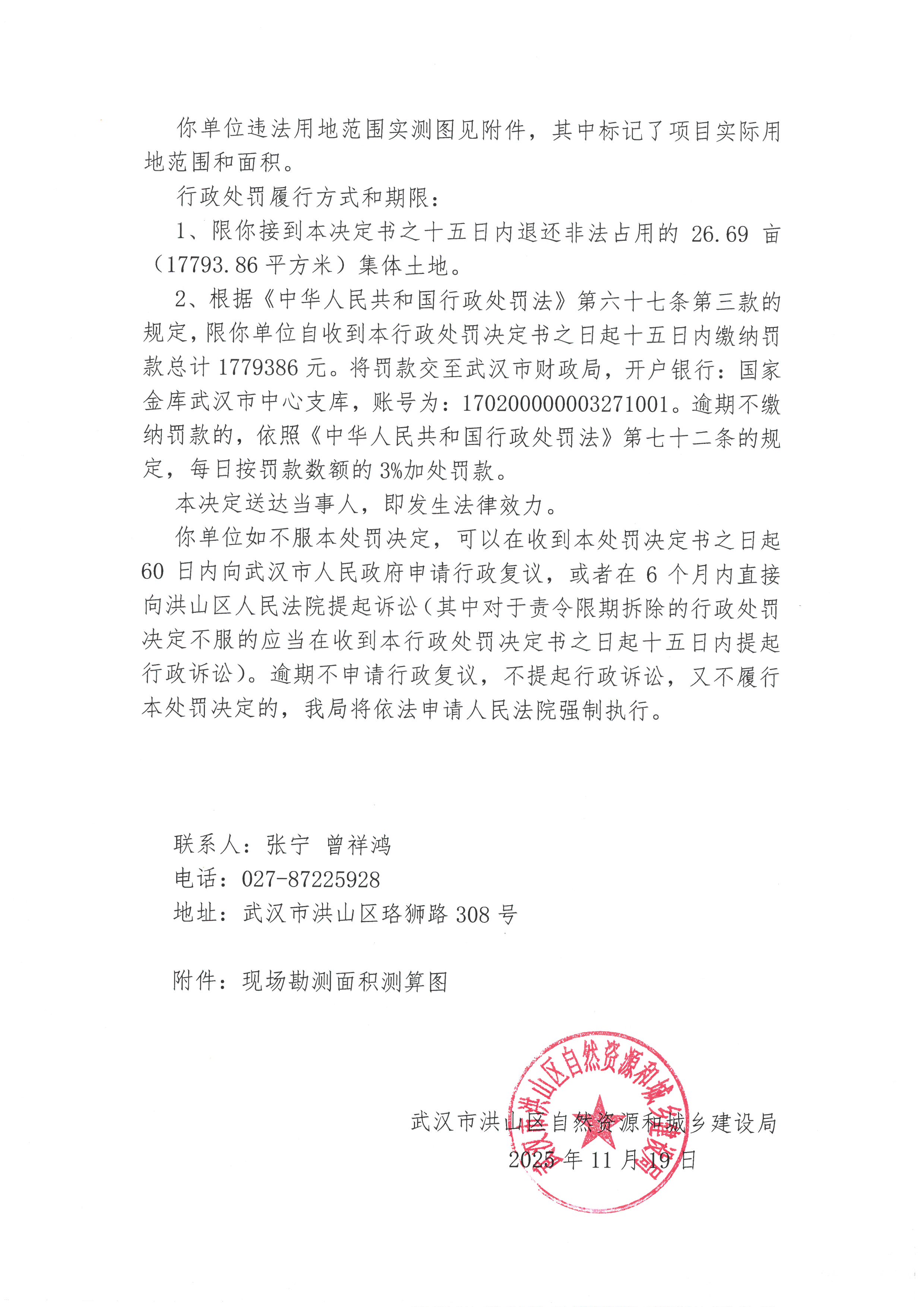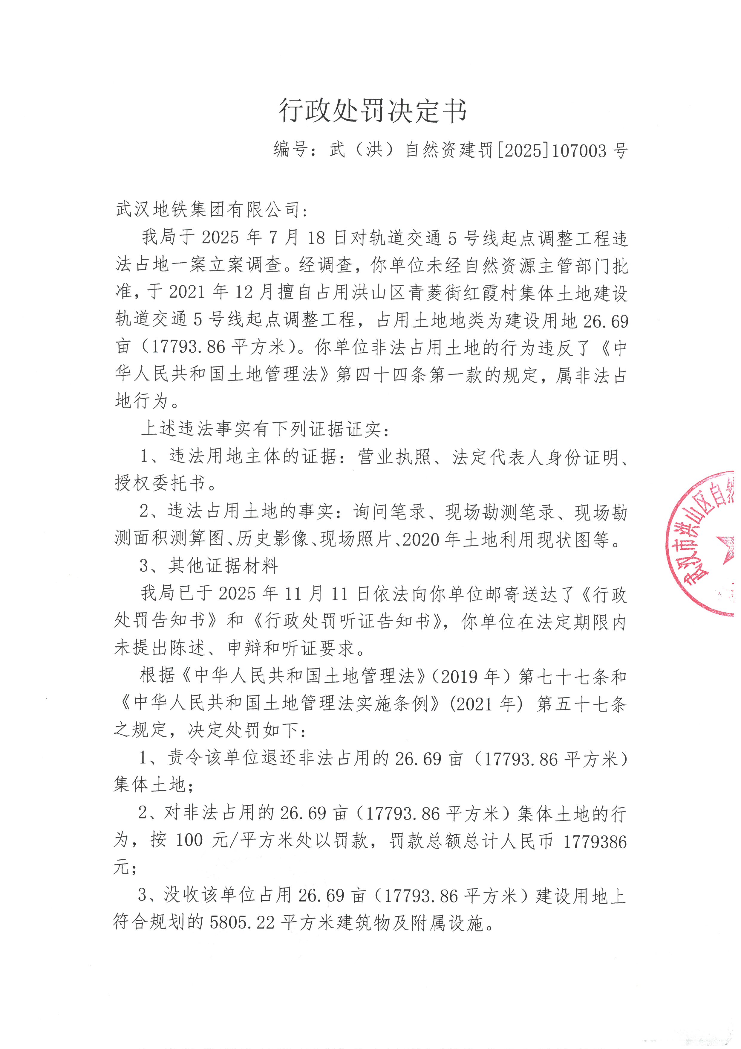 武汉地铁集团有限公司建设轨道交通5号线起点调整工程行政处罚决定书