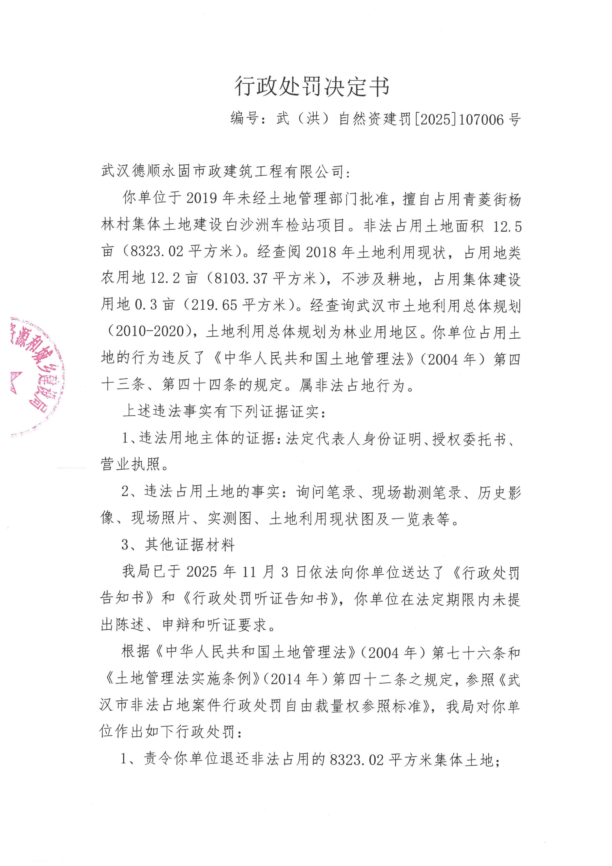 武汉德顺永固市政建筑工程有限公司建设白沙洲车检站项目行政处罚决定书