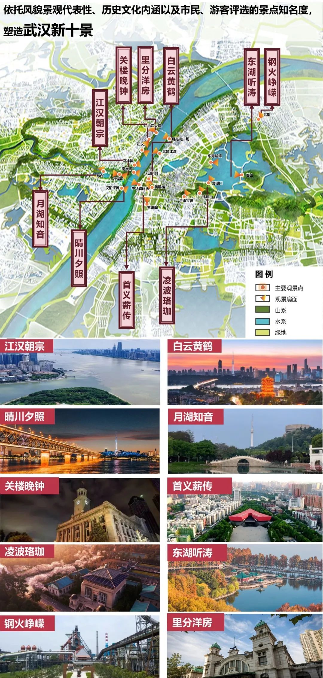 为挖掘武汉历史文化魅力,综合历史文化典故、地域景观以及市民、游客的城市印象,主城范围内将塑造十大文化景观,包括:江汉朝宗、白云黄鹤、晴川夕照、月湖知音、关楼晚钟、首义薪传、凌波珞珈、东湖听涛、钢火峥嵘、里分洋房。