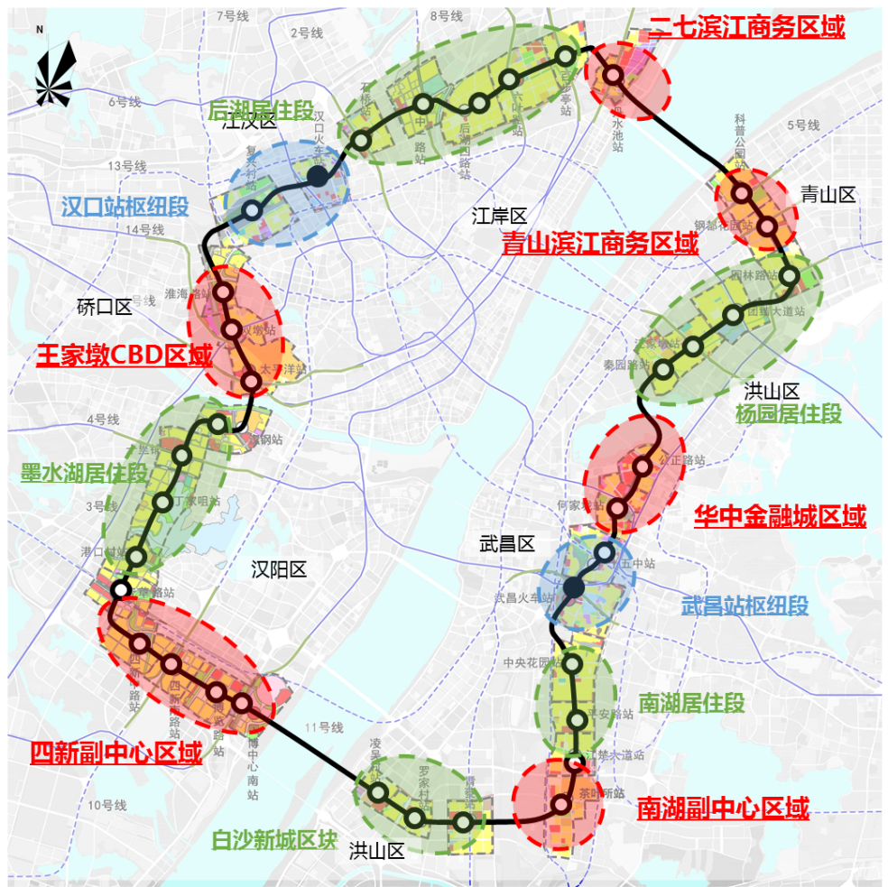 12号线全线与规划19条轨道线路以及汉口火车站、武昌火车站进行换乘衔接,沿线串联武汉市多个重点功能区,并毗邻多个大型生活社区,规划从大区域轨道交通线网和城市功能结构出发,全面梳理12号线的轨道交通条件和沿线功能特征,引导站城一体化开发。