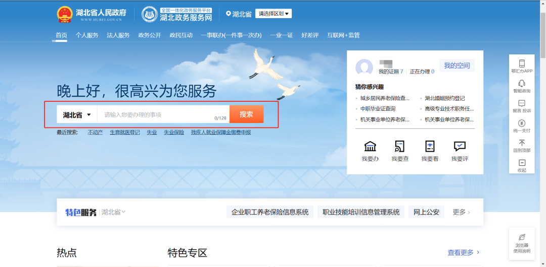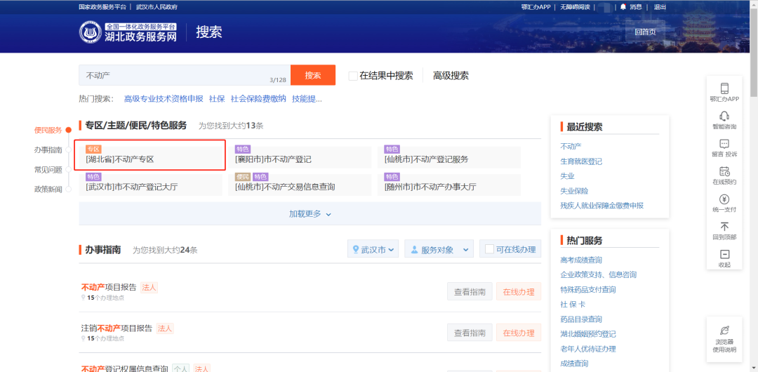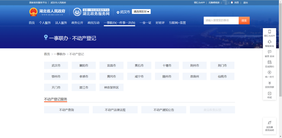 1.打开并登录湖北政务服务网(http://zwfw.hubei.gov.cn/),在首页搜索“不动产”。