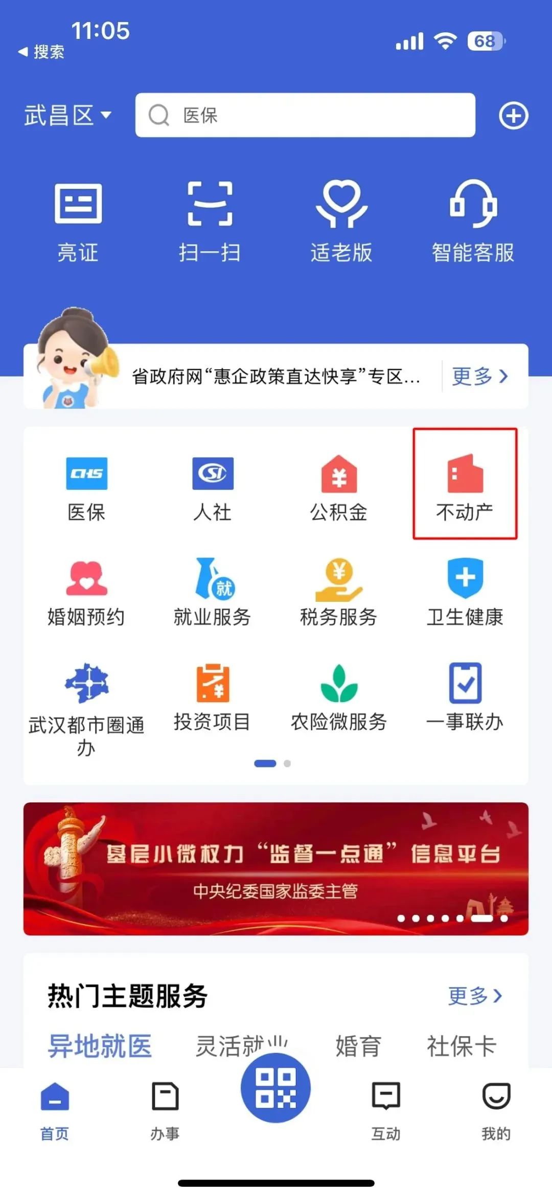 1.打开并登录“鄂汇办”APP,在首页点击“不动产”。
