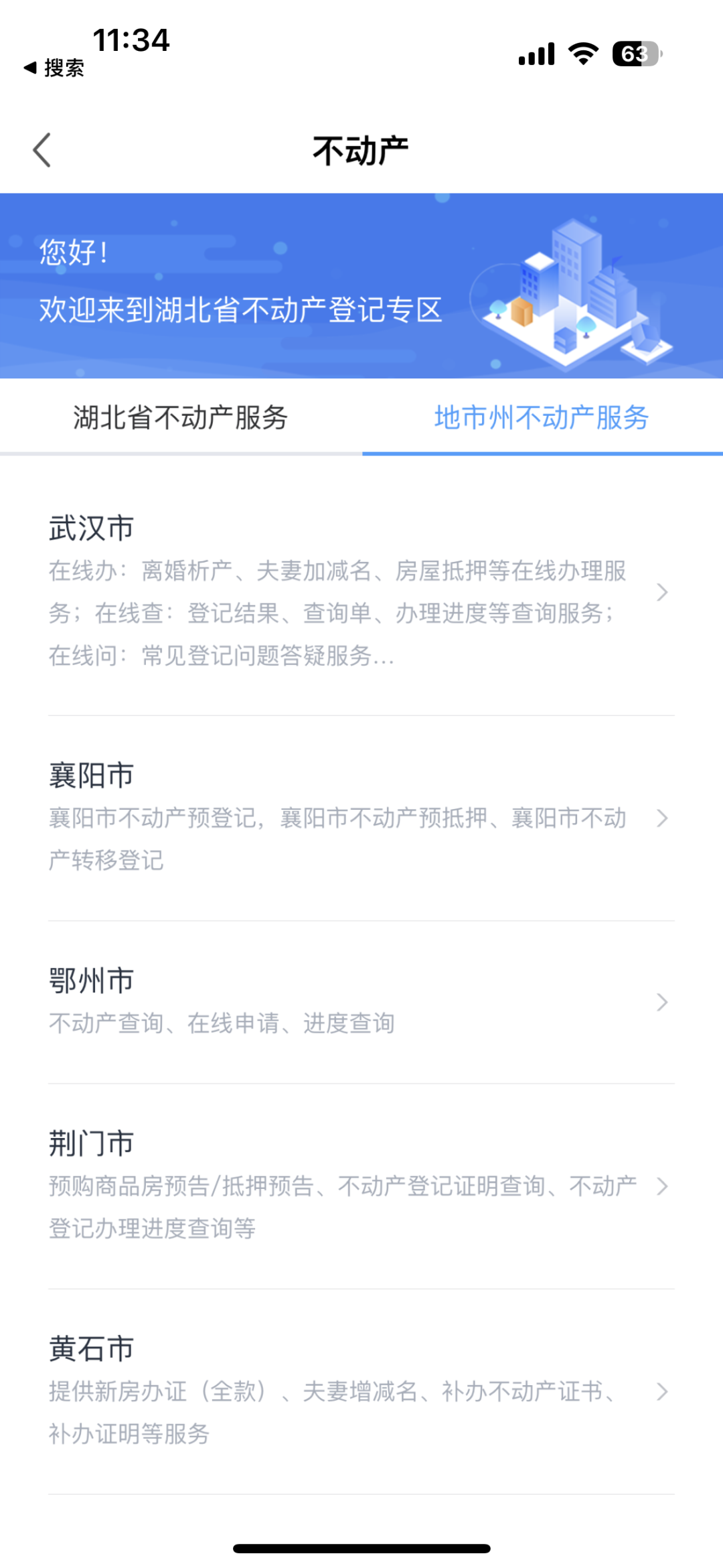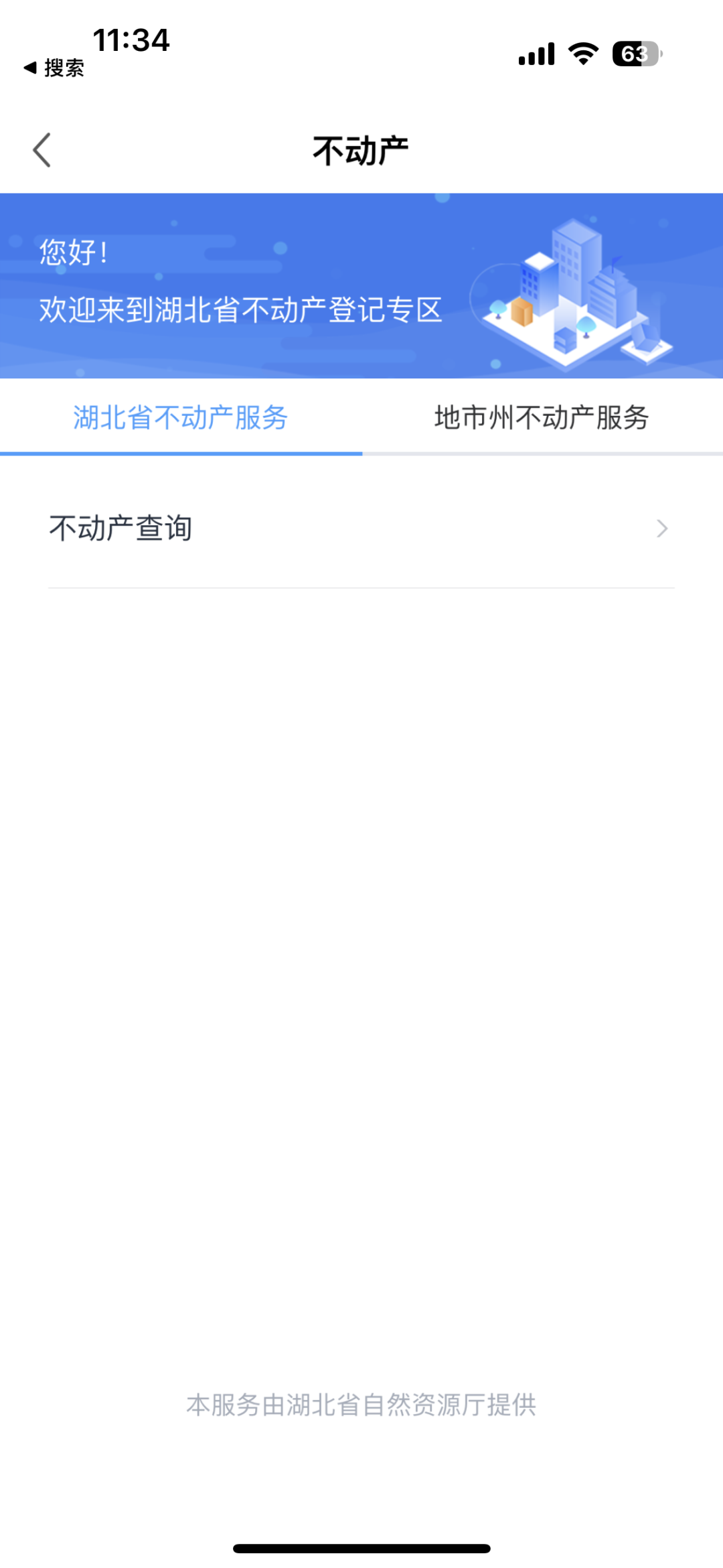 2.在“湖北省不动产服务”下方可进行“不动产查询”,其他业务办理需选择所在的地区