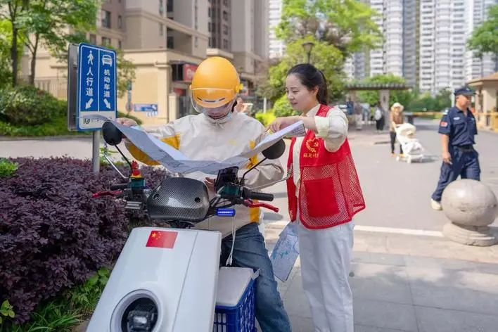 藏龙社区志愿者为快递小哥讲解民生地图。
