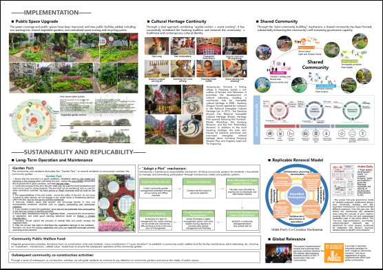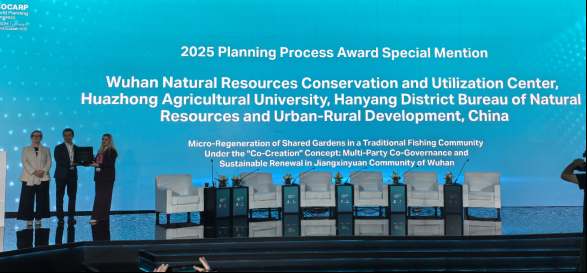 近日,在沙特阿拉伯首都利雅得举行的第61届世界规划大会(61st ISOCARP World Planning Congress)上,由武汉市自然资源保护利用中心、华中农业大学与汉阳区自然资源和城乡建设局联合报送的 “‘共同缔造’理念下的传统渔业社区共享花园微改造 —— 武汉江欣苑社区多元共治与可持续更新实践” 项目,凭借创新的治理模式与显著的实践成效,成功获得大会新设立的规划实践奖特别提名(Planning Process Award-Special Mention),为武汉城市更新实践赢得了国际赞誉,国际城市与区域规划师学会主席Elisabeth Belpaire为该项目颁奖。