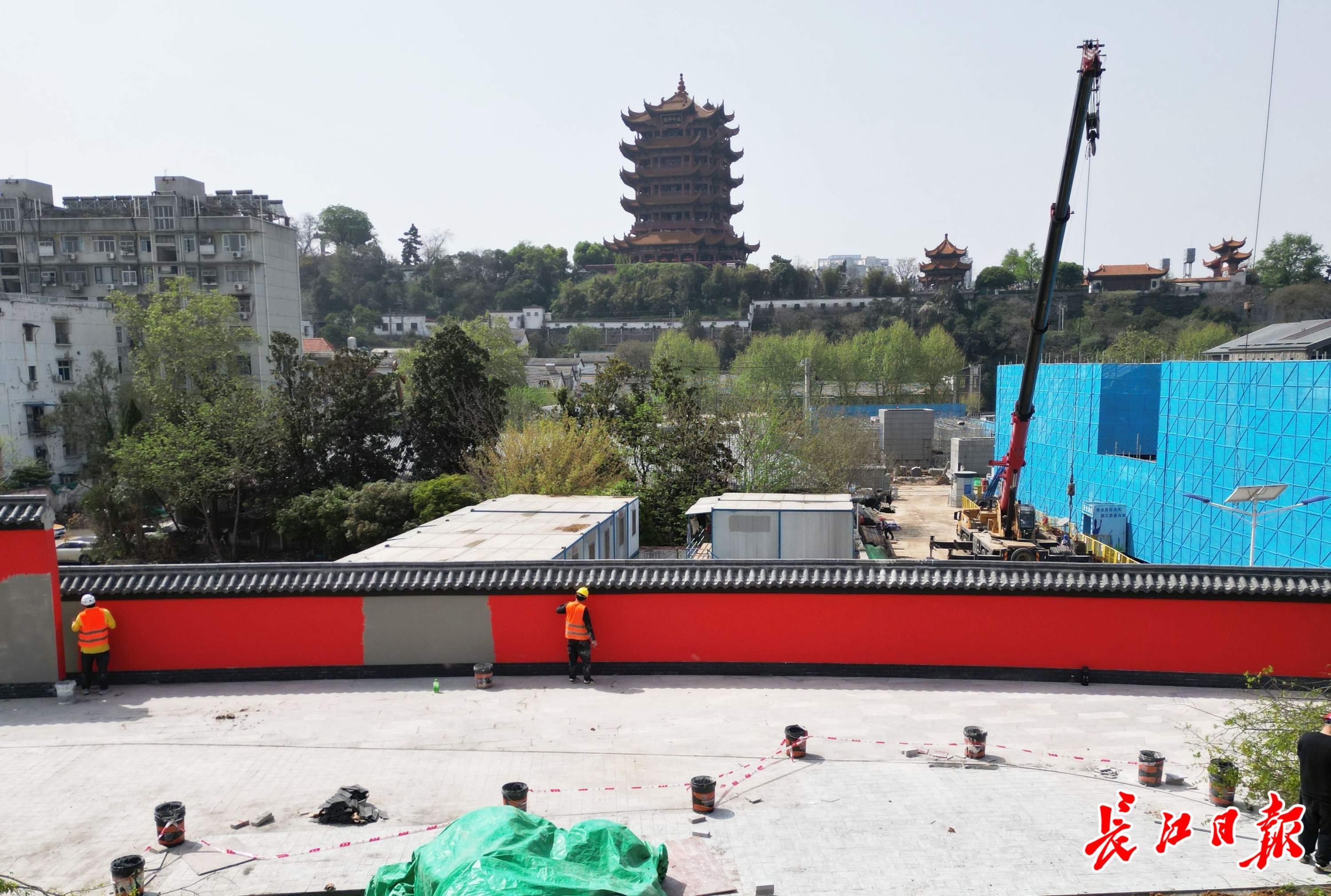 4月22日,记者自“新红墙”步入建设区域,这里挖机穿梭、施工有序,一栋已经修缮的优秀历史建筑静静矗立:青绿琉璃覆顶,朱砂梁柱焕彩,与远方黄鹤楼的飞檐翘角遥相呼应。此处正是得胜桥千年古轴南端、经心书院项目现场。